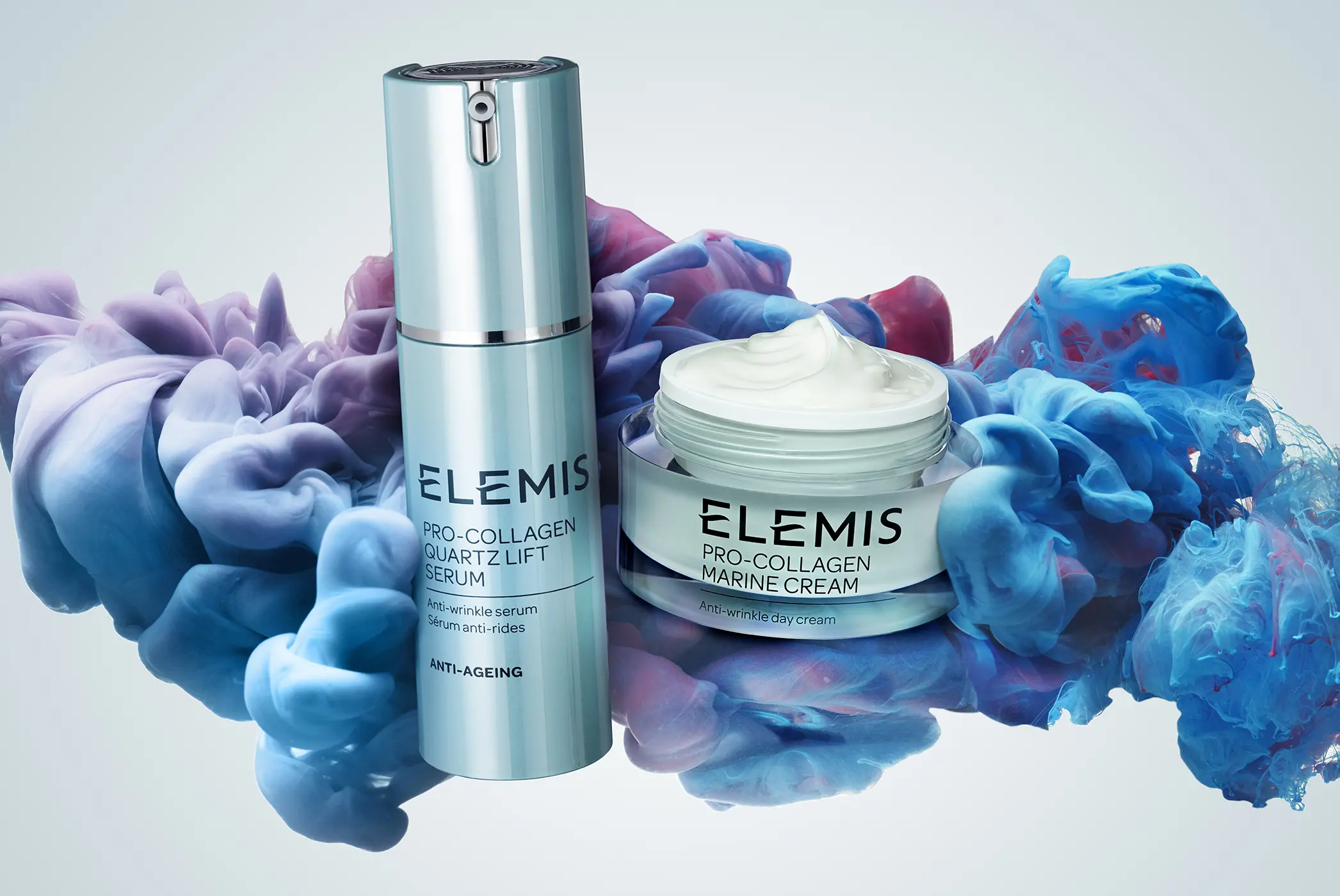 The Elemis Pro-Collagen campaign, “Beauty Beneath the Surface,” transforms clinical skincare into a visually arresting still life. The imagery heroically frames the products within sculptural clouds of colour, using precision lighting and fluid motion to echo the products’ marine science credentials. Showcasing the power of expertly crafted product photography.