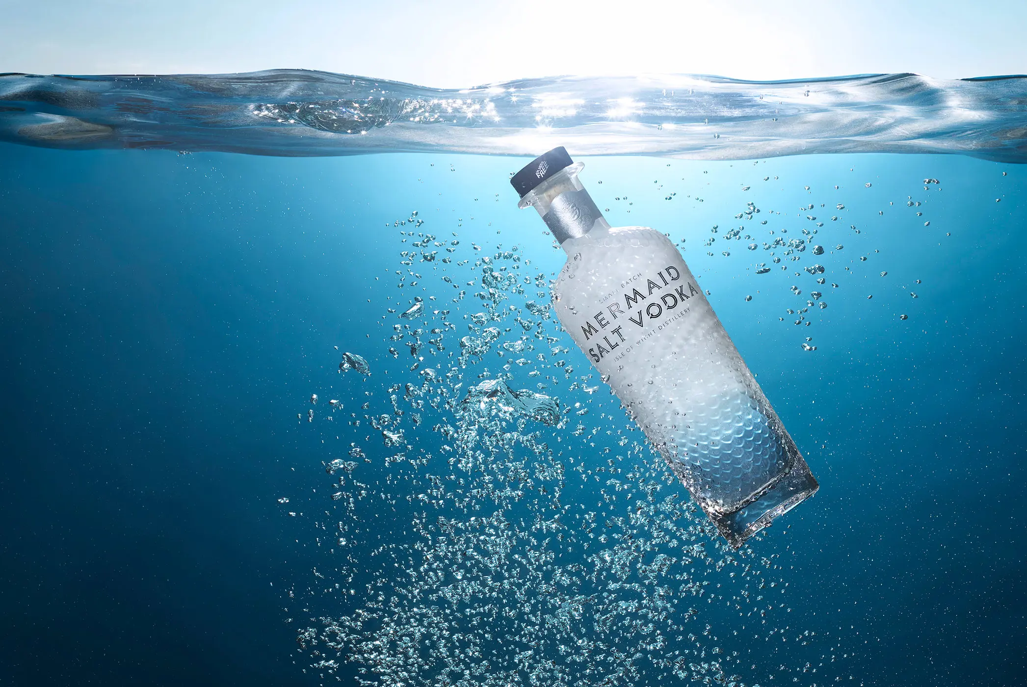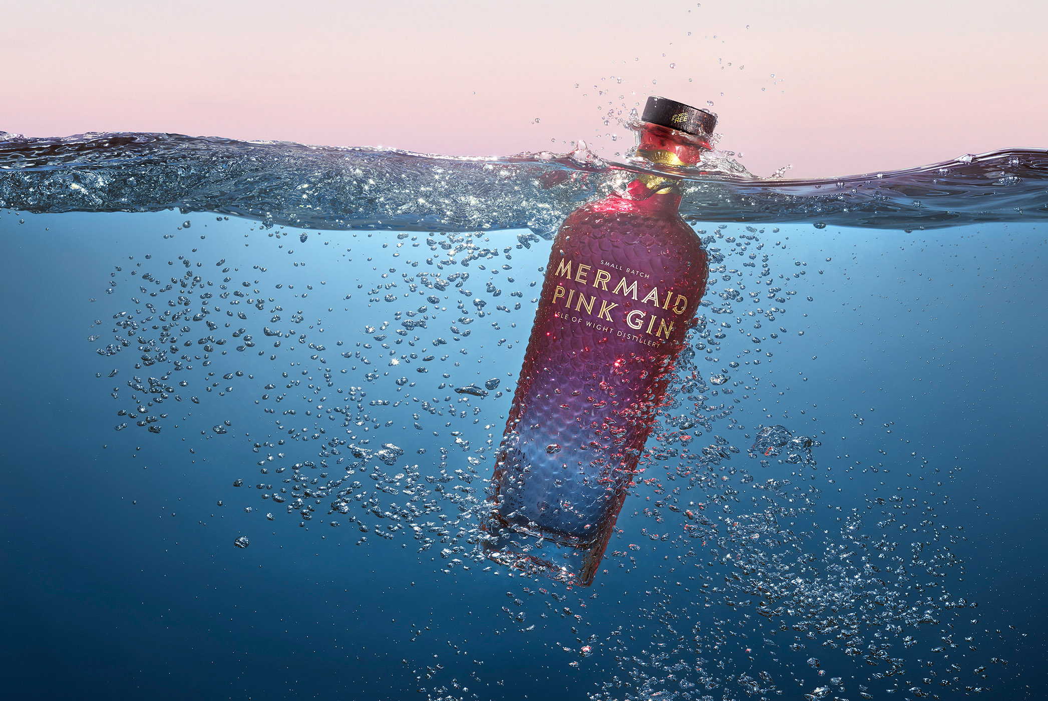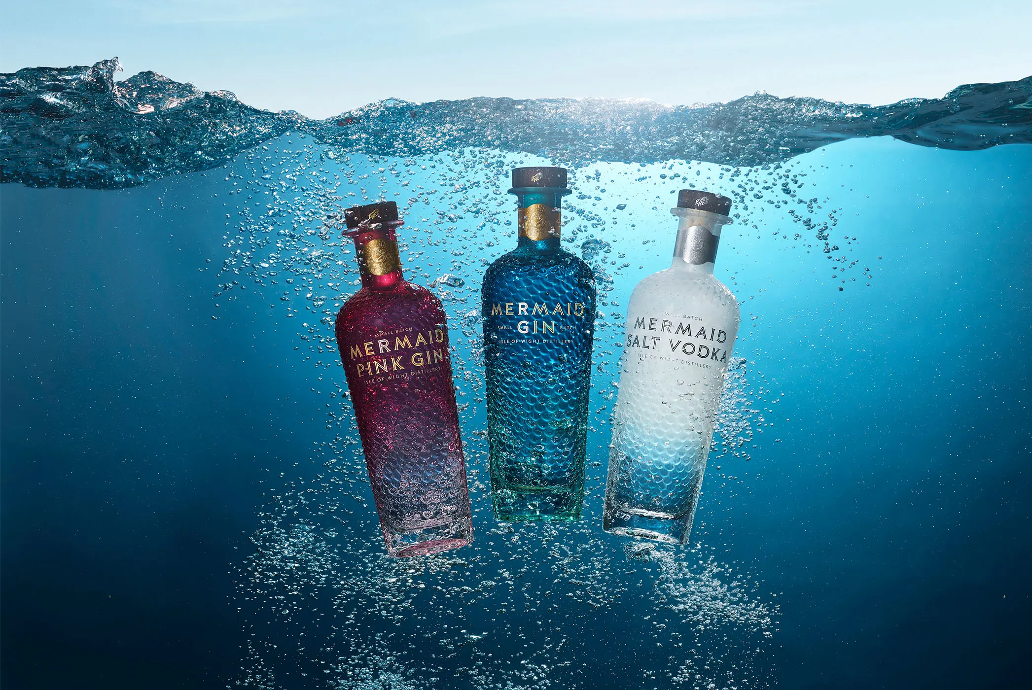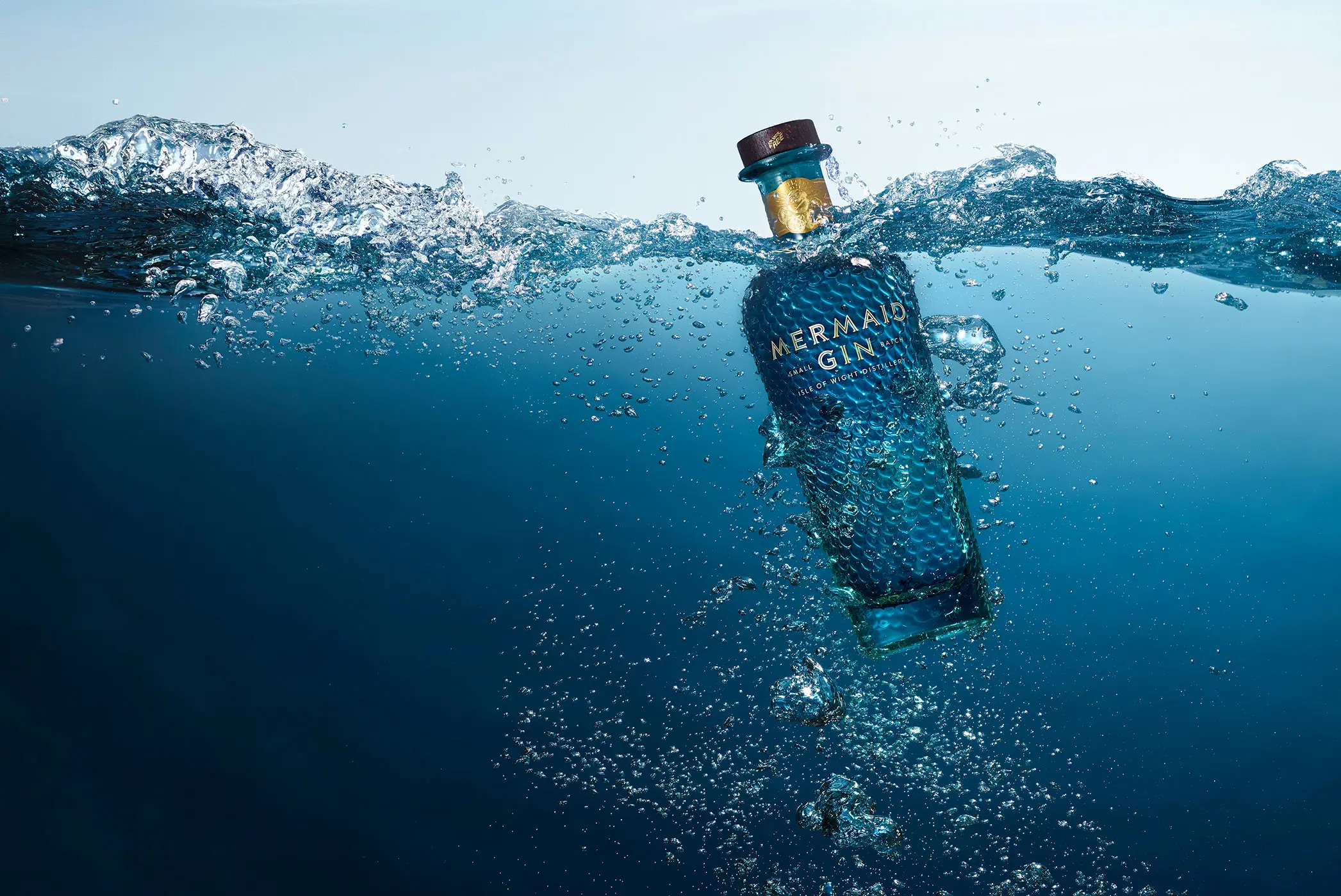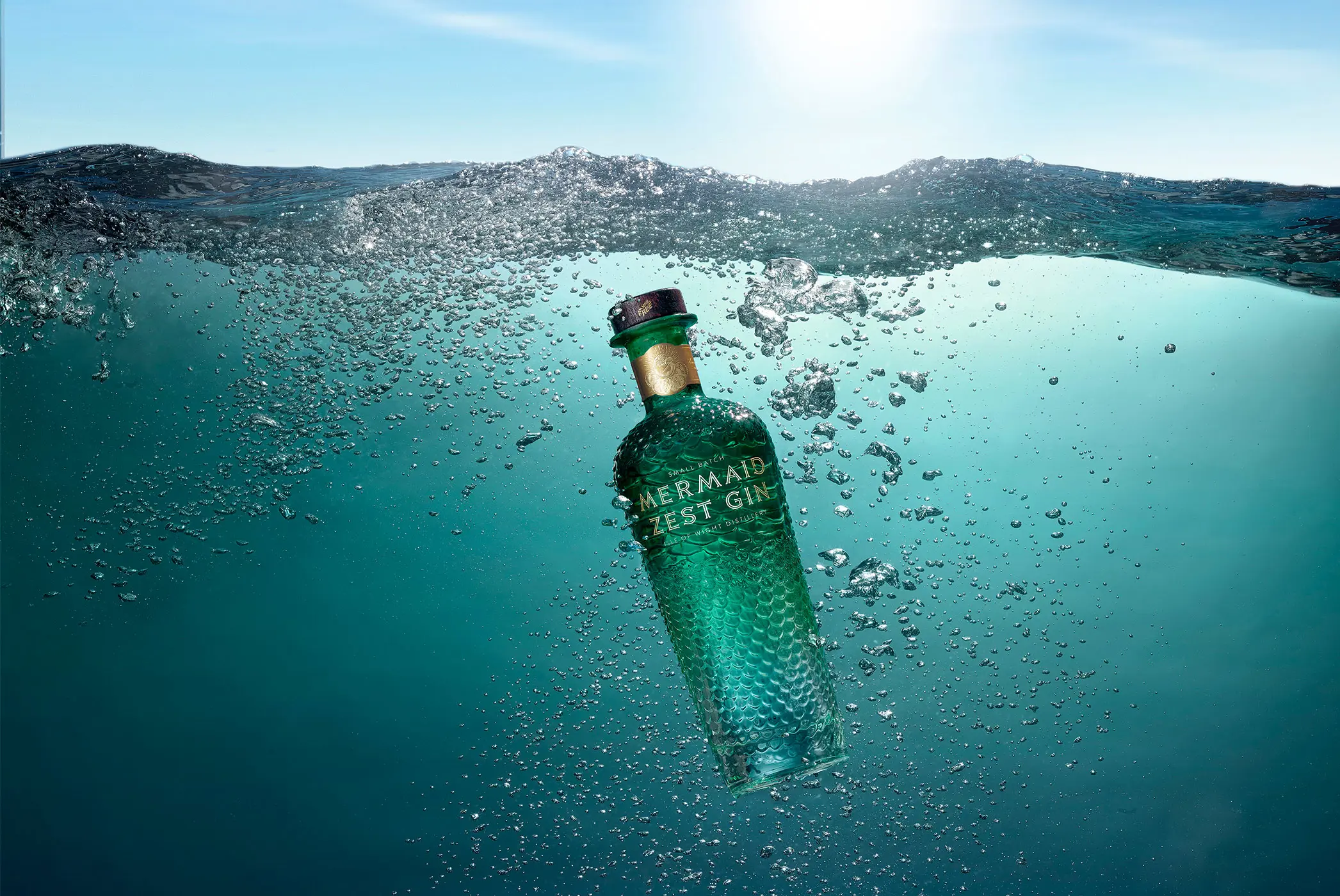 Mermaid Gin ad campaign photographed by Graeme Montgomery, showcasing the premium Isle of Wight crafted spirit with captivating visuals that reflect its coastal heritage, mythic inspiration, and luxurious design.
